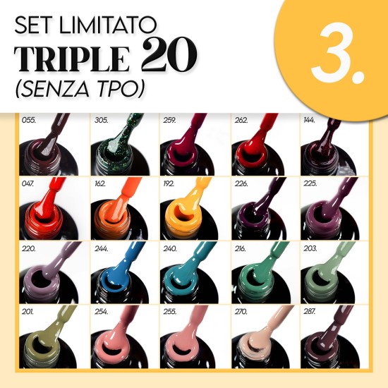 20 tonalità amatissime di Gel Polish in un unico set – per la prima volta, e per l’ultima. Questo è il Triple 20: una selezione XXL a tempo limitato, pensata per chi vuole passare ai prodotti senza TPO in modo rapido, sicuro e senza compromessi. ...