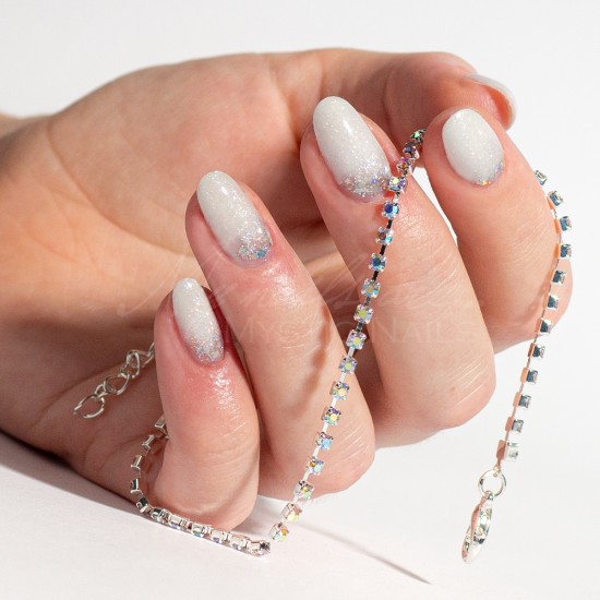 Una base bianca per semipermanente arricchito con minuscoli glitter, che può essere utilizzata sotto il colore o da sola.