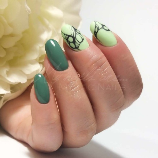 F. Applicare uno strato sottile del colore di gel polisho gel Mystic Nails scelto e ben pigmentato, quindi polimerizzare con luce UV (2 minuti) o LED (1 minuto).